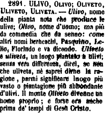| Ulivo, Olivo; Oliveto, Uliveto, Uliveta - Ulivo, nome della pianta nota che produce le ulive; Olivo, nome d'uomo; ma più da commedia che da senno: come altri nomi berneschi, Pasquìno, Lelio, Florindo e va dicendo. Uliveto e uliveta, un luogo piantato a ulivi; senza vera differenza, direi, se non che uliveta, nè saprei dirne la ragione, parmi significare luogo più vasto o piantagione più abbondante d'ulivi. Il monte Oliveto divenne un nome proprio; e forse era anche prima de' tempi di Gesù Cristo. [immagine] |