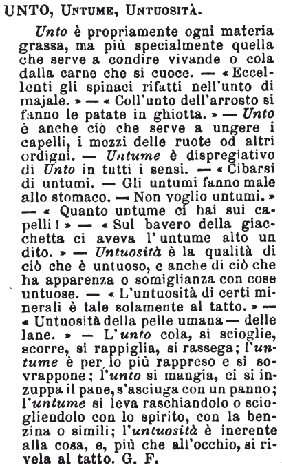 | Unto, Untume, Untuosità - Unto è propriamente ogni materia grassa, ma più specialmente quella che serve a condire vivande o cola dalla carne che si cuoce. - « Eccellenti gli spinaci rifatti nell'unto di majale. » - « Coll'unto dell'arrosto si fanno le patate in ghiotta. » - Unto è anche ciò che serve a ungere i capelli, i mozzi delle ruote od altri ordigni. - Untume è dispregiativo di Unto in tutti i sensi. - « Cibarsi di untumi. - Gli untumi fanno male allo stomaco. - Non voglio untumi. » - « Quanto untume ci hai sui capelli! » - « Sul bavero della giacchetta ci aveva l'untume alto un dito. » - Untuosità è la qualità di ciò che è untuoso, e anche di ciò che ha apparenza o somiglianza con cose untuose. - « L'untuosità di certi minerali è tale solamente al tatto. » - « Untuosità della pelle umana - delle lane. » - L'unto cola, si scioglie, scorre, si rappiglia, si rassega; l'untume è per lo più rappreso e si sovrappone; l'unto si mangia, ci si inzuppa il pane, s'asciuga con un panno; l'untume si leva raschiandolo o sciogliendolo con lo spirito, con la benzina o simili; l'untuosità è inerente alla cosa, e, più che all'occhio, si rivela al tatto. G. F. [immagine] |