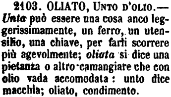 | Oliato, Unto d'olio - Unta può essere una cosa anco leggerissimamente, un ferro, un utensilio, una chiave, per farli scorrere più agevolmente; oliata si dice una pietanza o altro camangiare che con olio vada accomodata: unto dice macchia; oliato, condimento. [immagine] |