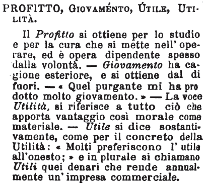 | Profitto, Giovamento, Utile, Utilità - Il Profitto si ottiene per lo studio e per la cura che si mette nell'operare, ed è opera dipendente spesso dalla volontà. - Giovamento ha cagione esteriore, e si ottiene dal di fuori. - «Quel purgante mi ha prodotto molto giovamento.» - La voce Utilità, si riferisce a tutto ciò che apporta vantaggio così morale come materiale. - Utile si dice sostantivamente, come per il concreto della Utilità: «Molti preferiscono l'utile all'onesto;» e in plurale si chiamano Utili quei denari che rende annualmente un'impresa commerciale. [immagine] |