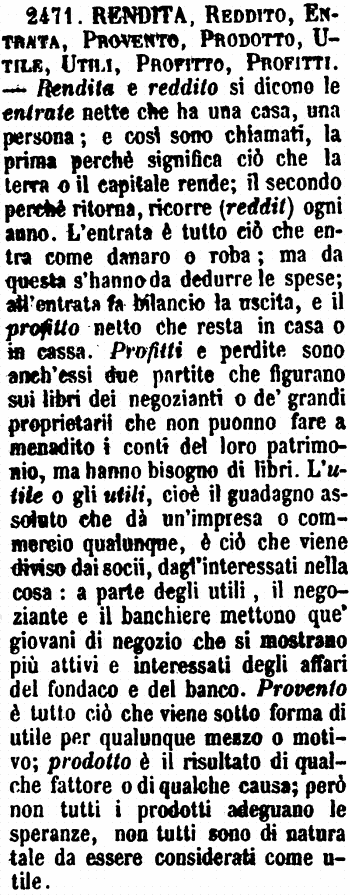 | Rendita, Reddito, Entrata, Provento, Prodotto, Utile, Utili, Profitto, Profitti - Rendita e reddito si dicono le entrate nette che ha una casa, una persona; e così sono chiamati, la prima perchè significa ciò che la terra o il capitale rende; il secondo perchè ritorna, ricorre (reddit) ogni anno. L'entrata è tutto ciò che entra come danaro o roba; ma da questa s'hanno da dedurre le spese; all'entrata fa bilancio la uscita, e il profitto netto che resta in casa o in cassa. Profitti e perdite sono anch'essi due partite che figurano sui libri dei negozianti o de' grandi proprietarii che non puonno fare a menadito i conti del loro patrimonio, ma hanno bisogno di libri. L'utile o gli utili, cioè il guadagno assoluto che dà un'impresa o commercio qualunque, è ciò che viene diviso dai socii, dagl'interessati nella cosa: a parte degli utili, il negoziante e il banchiere mettono que' giovani di negozio che si mostrano più attivi e interessati degli affari del fondaco e del banco. Provento è tutto ciò che viene sotto forma di utile per qualunque mezzo o motivo; prodotto è il risultato di qualche fattore o di qualche causa; però non tutti i prodotti adeguano le speranze, non tutti sono di natura tale da essere considerati come utile. [immagine] |