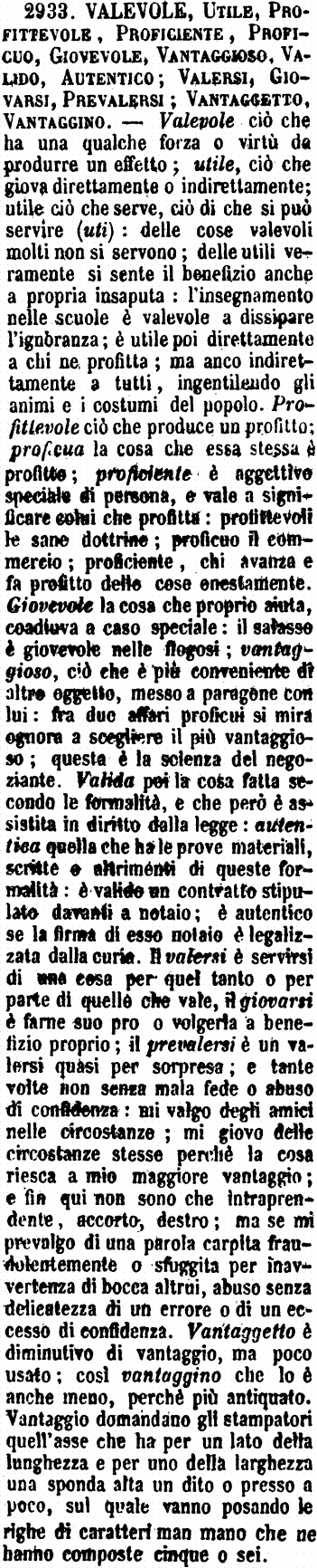 | Valevole, Utile, Profittevole, Proficiente, Proficuo, Giovevole, Vantaggioso, Valido, Autentico; Valersi, Giovarsi, Prevalersi; Vantaggetto, Vantaggino - Valevole ciò che ha una qualche forza o virtù da produrre un effetto; utile, ciò che giova direttamente o indirettamente; utile ciò che serve, ciò di che si può servire (uti): delle cose valevoli molti non si servono; delle utili veramente si sente il benefizio anche a propria insaputa: l'insegnamento nelle scuole è valevole a dissipare l'ignoranza; è utile poi direttamente a chi ne profitta; ma anco indirettamente a tutti, ingentilendo gli animi e i costumi del popolo. Profittevole ciò che produce un profitto; proficua la cosa che essa stessa è profitto; proficiente è aggettivo speciale di persona, e vale a significare colui che profitta: profittevoli le sane dottrine; proficuo il commercio; proficiente, chi avanza e fa profitto delle cose onestamente. Giovevole la cosa che proprio aiuta, coadiuva a caso speciale: il salasso è giovevole nelle flogosi; vantaggioso, ciò che è più conveniente di altro oggetto, messo a paragone con lui: fra due affari proficui si mira ognora a scegliere il più vantaggioso; questa è la scienza del negoziante. Valida poi la cosa fatta secondo le formalità, e che però è assistita in diritto dalla legge: autentica quella che ha le prove materiali, scritte e altrimenti di queste formalità: è valido un contratto stipulato davanti a notaio; è autentico se la firma di esso notaio è legalizzata dalla curia. Il valersi è servirsi di una cosa per quel tanto o per parte di quello che vale, il giovarsi è farne suo pro o volgerla a benefizio proprio; il prevalersi è un valersi quasi per sorpresa; e tante volte non senza mala fede o abuso di confidenza: mi valgo degli amici nelle circostanze; mi giovo delle circostanze stesse perchè la cosa riesca a mio maggiore vantaggio; e fin qui non sono che intraprendente, accorto, destro; ma se mi prevalgo di una parola carpita frudolentemente o sfuggita per inavvertenza di bocca altrui, abuso senza delicatezza di un errore o di un eccesso di confidenza. Vantaggetto è diminutivo di vantaggio, ma poco usato; così vantaggino che lo è anche meno, perchè più antiquato. Vantaggio domandano gli stampatori quell'asse che ha per un lato della lunghezza e per uno della larghezza una sponda alta un dito o presso a poco, sul quale vanno posando le righe di caratteri man mano che ne hanno composte cinque o sei. [immagine] |