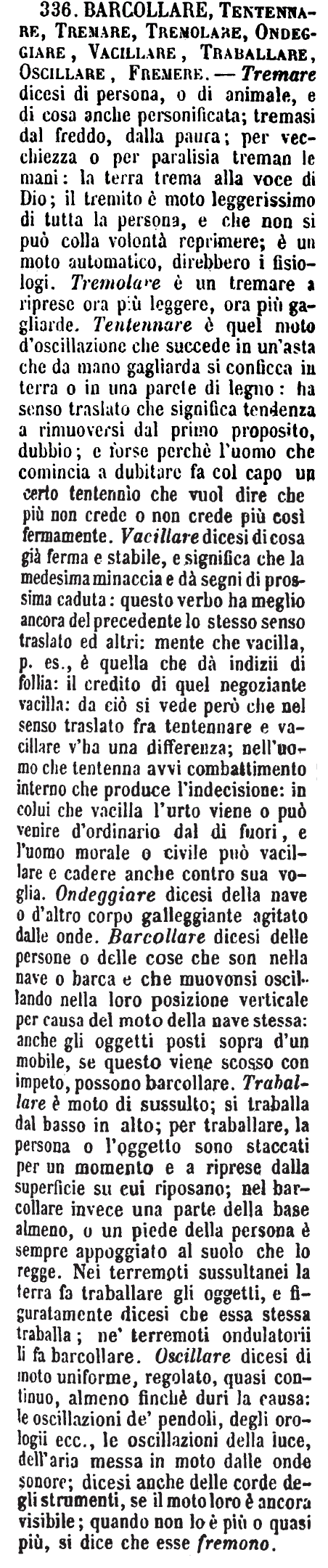 | Barcollare, Tentennare, Tremare, Tremolare, Ondeggiare, Vacillare, Traballare, Oscillare, Fremere - Tremare dicesi di persona, o di animale, e di cosa anche personificata; tremasi dal freddo, dalla paura; per vecchiezza o per paralisia treman le mani: la terra trema alla voce di Dio; il tremito è moto leggerissimo di tutta la persona, e che non si può colla volontà reprimere; è un moto automatico, direbbero i fisiologi. Tremolare è un tremare a riprese ora più leggere, ora più gagliarde. Tentennare è quel moto d'oscillazione che succede in un'asta che da mano gagliarda si conficca in terra o in una parete di legno: ha senso traslato che significa tendenza a rimuoversi dal primo proposito, dubbio; e forse perchè l'uomo che comincia a dubitare fa col capo un certo tentennìo che vuol dire che più non crede o non crede più così fermamente. Vacillare dicesi di cosa già ferma e stabile, e significa che la medesima minaccia e dà segni di prossima caduta: questo verbo ha meglio ancora del precedente lo stesso senso traslato ed altri: mente che vacilla, p. es., è quella che dà indizii di follia: il credito di quel negoziante vacilla: da ciò si vede però che nel senso traslato fra tentennare e vacillare v'ha una differenza; nell'uomo che tentenna avvi combattimento interno che produce l'indecisione: in colui che vacilla l'urto viene o può venire d'ordinario dal di fuori, e l'uomo morale o civile può vacillare e cadere anche contro sua voglia. Ondeggiare dicesi della nave o d'altro corpo galleggiante agitato dalle onde. Barcollare dicesi delle persone o delle cose che son nella nave o barca e che muovonsi oscillando nella loro posizione verticale per causa del moto della nave stessa: anche gli oggetti posti sopra d'un mobile, se questo viene scosso con impeto, possono barcollare. Traballare è moto di sussulto; si traballa dal basso in alto; per traballare, la persona o l'oggetto sono staccati per un momento e a riprese dalla superficie su cui riposano; nel barcollare invece una parte della base almeno, o un piede della persona è sempre appoggiato al suolo che lo regge. Nei terremoti sussultanei la terra fa traballare gli oggetti, e figuratamente dicesi che essa stessa traballa; ne' terremoti ondulatorii li fa barcollare. Oscillare dicesi di moto uniforme, regolato, quasi continuo, almeno finchè duri la causa: le oscillazioni de' pendoli, degli orologii ecc., le oscillazioni della luce, dell'aria messa in moto dalle onde sonore; dicesi anche delle corde degli strumenti, se il moto loro è ancora visibile; quando non lo è più o quasi più, si dice che esse fremono. [immagine] |