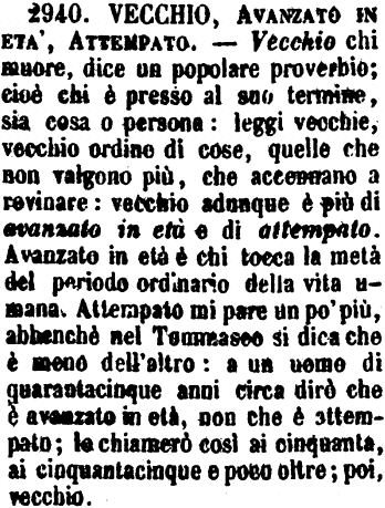 | Vecchio, Avanzato in età, Attempato - Vecchio chi muore, dice un popolare proverbio; cioè chi è presso al suo termine, sia cosa o persona: leggi vecchie, vecchio ordine di cose, quelle che non valgono più, che accennano a rovinare: vecchio adunque è più di avanzato in età e di attempato. Avanzato in età è chi tocca la metà del periodo ordinario della vita umana. Attempato mi pare un po' più, abbenchè nel Tommaseo si dica che è meno dell'altro: a un uomo di quarantacinque anni circa dirò che è avanzato in età, non che è attempato; lo chiamerò così ai cinquanta, ai cinquantacinque e poco oltre; poi, vecchio. [immagine] |