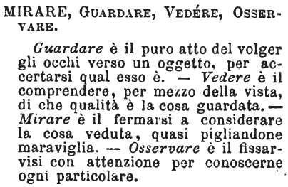 | Mirare, Guardare, Vedere, Osservare - Guardare è il puro atto del volger gli occhi verso un oggetto, per accertarsi qual esso è. - Vedere è il comprendere, per mezzo della vista, di che qualità è la cosa guardata. - Mirare è il fermarsi a considerare la cosa veduta, quasi pigliandone maraviglia. - Osservare è il fissarvisi con attenzione per conoscerne ogni particolare. [immagine] |