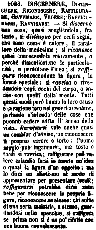 | Discernere, Distinguere, Riconoscere, Raffigurare, Ravvisare, Vedere; Raffigurarsi, Ravvisarsi - Si discerne una cosa, quasi scegliendola, fra tante; si distingue per certi segni, che sono come il colore, il carattere della medesima; si riconosce quasi conoscendola nuovamente, o perchè dimenticatene le particolarità, o perdutane l'idea; si raffigura riconoscendone la figura, la forma speciale; si ravvisa o rivedendola cogli occhi del corpo, o anche con quelli della mente. Tutti questi modi però hanno la loro causa e la ragione loro nel generico vedere, parlando s'intende delle cose che puonno cadere sotto il senso della vista. Ravvisarsi vale anche quasi un cambiar d'avviso, un riconoscere il proprio errore o torto: l'uomo saggio può ingannarsi, ma tosto o tardi si ravvisa; raffigurare può valere eziandio farsi in mente un'idea o quasi la figura d'un oggetto; ma lo direi un idiotismo al modo di appresentare per presentare (vedi); raffigurarsi potrebbe dirsi assai bene per riconoscere la propria figura, riconoscere se stesso: chi sorte di una seria malattia, a stento, guardandosi nello specchio, si raffigura se prima non si è un po' rifatto con una buona convalescenza. [immagine] |