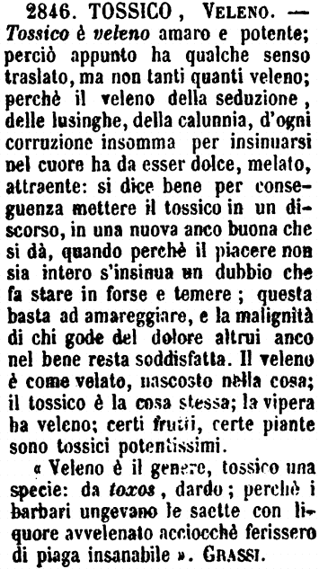 « Queste due voci, nel loro senso proprio e naturale, differiscono ben poco l'una dall'altra; nel figurato assai più. Veleno si prende per ogni cosa che sia per fare o faccia grave danno o mortale; quindi per Odio rabbioso che minaccia e spira morte, e per Eccesso di passione che trascini l'uomo all'estremo; e però si dice il veleno dell'amore, e non il tossico; il veleno e non il tossico delle parole; animo avvelenato, e non attossicato: ond'è che veleno è voce di stil nobile e poetico; tossico è di stil familiare, nè si può adoperare nei componimenti poetici, se non tronca e ridotta in tosco. L'uso poi ha distinto il tossico dal veleno per la qualità del sapore, che è sempre amaro in tossico e non sempre in veleno, il quale è ben sovente dolce, soave, ecc. Tossico è inoltre vocabolo più tecnico di veleno, di modo che la differenza viene talvolta a mostrarsi non solo da maggiore a minore, ma da generale a particolare. Quella vecchia famosa chiamata Locusta, ornamento della Corte di Nerone, stillava i veleni, e tra questi manipolava il tossico: i Barbari ungevano la punta delle loro saette col tossico, perchè facessero piaga insanabile. « Basti l'accennata distinzione per l'uso esatto delle due parole, ma ove si volesse trovar pur modo di fissarne il significato proprio e differenziarlo con aggiustatezza, oserei dire che veleno è generico d'ogni sostanza velenosa tanto animale quanto vegetabile e minerale, e tossico è particolare delle sole sostanze velenose vegetabili e minerali. Sembra che a questa diversità caratteristica sia da riferirsi l'uso di dire il veleno della vipera, del drago, dell'aspide, e non il tossico; e per lo contrario, il tossico arsenicale, il tossico della cicuta, il tossico dell'aconito, il tossico antimoniale. » - [Tosco è voce solo della poesia, nella quale per abuso fa le veci del Tossico e del Veleno. G. F.] [immagine] |