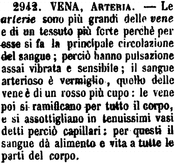 | Vena, Arteria - Le arterie sono più grandi delle vene e di un tessuto più forte perchè per esse si fa la principale circolazione del sangue; perciò hanno pulsazione assai vibrata e sensibile; il sangue arterioso è vermiglio, quello delle vene è di rosso più cupo: le vene poi si ramificano per tutto il corpo, e si assottigliano in tenuissimi vasi detti perciò capillari: per questi il sangue dà alimento e vita a tutte le parti del corpo. [immagine] |