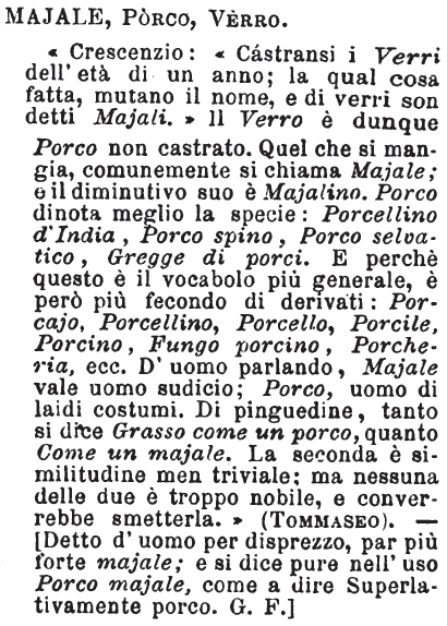 | Majale, Porco, Verro - «Crescenzio: «Cástransi i Verri dell'età di un anno; la qual cosa fatta, mutano il nome, e di verri son detti Majali.» Il Verro è dunque Porco non castrato. Quel che si mangia, comunemente si chiama Majale; e il diminutivo suo è Majalino. Porco dinota meglio la specie: Porcellino d'India, Porco spino, Porco selvatico, Gregge di porci. E perchè questo è il vocabolo più generale, è però più fecondo di derivati: Porcajo, Porcellino, Porcello, Porcile, Porcino, Fungo porcino, Porcheria, ecc. D'uomo parlando, Majale vale uomo sudicio; Porco, uomo di laidi costumi. Di pinguedine, tanto si dice Grasso come un porco, quanto Come un majale. La seconda è similitudine men triviale; ma nessuna delle due è troppo nobile, e converrebbe smetterla.» (Tommaseo). - [Detto d'uomo per disprezzo, par più forte majale; e si dice pure nell'uso Porco majale, come a dire Superlativamente porco. G. F.] [immagine] |