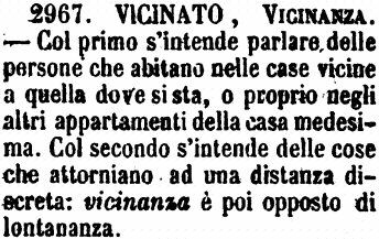| Vicinato, Vicinanza - Col primo s'intende parlare delle persone che abitano nelle case vicine a quella dove si sta, o proprio negli altri appartamenti della casa medesima. Col secondo s'intende delle cose che attorniano ad una distanza discreta: vicinanza è poi opposto di lontananza. [immagine] |