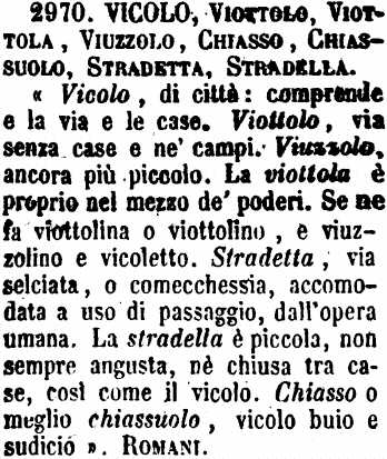 | Vicolo, Viottolo, Viottola, Viuzzolo, Chiasso, Chiassuolo, Stradetta, Stradella - «Vicolo, di città: comprende e la via e le case. Viottolo, via senza case e ne' campi. Viuzzolo, ancora più piccolo. La viottola è proprio nel mezzo de' poderi. Se ne fa viottolina o viottolino, e viuzzolino e vicoletto. Stradetta, via selciata, o comecchessia, accomodata a uso di passaggio, dall'opera umana. La stradella è piccola, non sempre angusta, nè chiusa tra case, così come il vicolo. Chiasso o meglio chiassuolo, vicolo buio e sudicio». Romani. [immagine] |