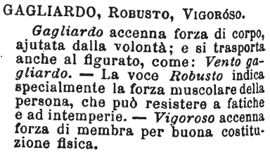 | Gagliardo, Robusto, Vigoroso - Gagliardo accenna forza di corpo, ajutata dalla volontà; e si trasporta anche al figurato, come: Vento gagliardo. - La voce Robusto indica specialmente la forza muscolare della persona, che può resistere a fatiche e ad intemperie. - Vigoroso accenna forza di membra per buona costituzione fisica. [immagine] |