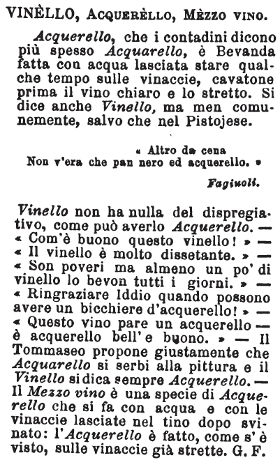 | Vinello, Acquerello, Mezzo vino - Acquerello, che i contadini dicono più spesso Acquarello, è Bevanda fatta con acqua lasciata stare qualche tempo sulle vinaccie, cavatone prima il vino chiaro e lo stretto. Si dice anche Vinello, ma men comunemente, salvo che nel Pistojese.