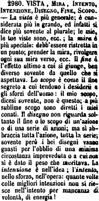 | Vista, Mira, Intento, Intenzione, Disegno, Fine, Scopo - La vista è più generale; è considerata più in grande, ed infatti si dice più sovente al plurale; le mie, le tue viste sono, ecc.; la mira è più speciale: debb'essere ristretta in un punto; prender la mira, rivolgere ogni sua mira verso, ecc. Il fine è l'effetto ultimo a cui si giunge, ben diverso sovente da quello che si aspettava. Lo scopo è come il fine segreto a cui tendono i desiderii e gli sforzi dell'uomo: il mio scopo, dicesi sovente, non è questo; a più sublime scopo sono diretti i miei conati. Il disegno non riguarda soltanto il fine o lo scopo di un'azione o di una serie di azioni; ma sì abbraccia tutta l'azione, tutta la serie; sovente però i bei disegni vanno guasti per l'obblio di una minima circostanza impreveduta o a cui non si è dato il peso che meritava. La intenzione è nell'idea; l'intento, nello sforzo, nell'opera: quante volte colle migliori intenzioni non si riesce nell'intento per mancanza di volontà, di energia! [immagine] |