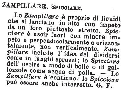 | Zampillare, Spicciare - Lo Zampillare è proprio di liquidi che si lanciano in alto con impeto da un foro piuttosto stretto. Spicciare è uscir fuori con minore impeto e perpendicolarmente e orizzontalmente, non verticalmente. Zampillare include l'idea del dividersi come in lunghi spruzzi; lo Spicciare dell'uscire a modo di bolle o di gallozzole come acqua di polla. - Lo Zampillare è continuo; lo Spicciare può essere anche interrotto. G. F. [immagine] |
